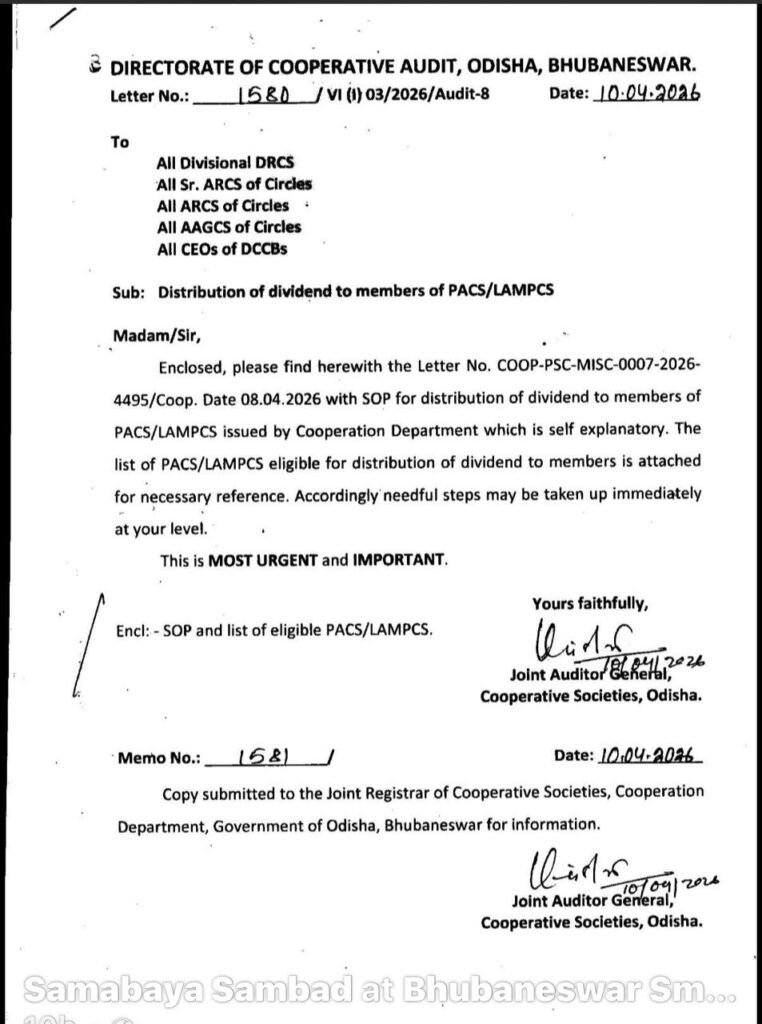 ଭୁବନେଶ୍ୱର:ରାଜ୍ୟ ସମବାୟ ବିଭାଗ ଦ୍ୱାରା ଜାରୀ ହୋଇଥିବା ଚିଠି ସଂଖ୍ୟା 1580, ତାରିଖ 10/04/2026, ଯାହାକୁ “Most Urgent and Important” ଭାବେ ଚିହ୍ନିତ କରାଯାଇଛି, ସେହି ଚିଠିକୁ ନେଇ ସମବାୟ ମହଳରେ ଭାରି ଅସନ୍ତୋଷ ଓ ଚର୍ଚ୍ଚା ଦେଖାଦେଇଛି।ଓଡିଶାରେ ସାଧାରଣତଃ PACS ମାନଙ୍କର ଡିଭିଡେଣ୍ଟ ଟଙ୍କା କେନ୍ଦ୍ର ସମବାୟ ବ୍ୟାଙ୍କ ଦ୍ୱାରା ସଂଗ୍ରହ ହୋଇ ପରେ ରାଜ୍ୟ ସମବାୟ ବ୍ୟାଙ୍କକୁ ପହଞ୍ଚୁଛି। କିନ୍ତୁ ଏହି ଟଙ୍କାକୁ ଅନ୍ୟ ବ୍ୟାଙ୍କରେ ରଖି ବ୍ୟୟବହୁଳ କାର୍ଯ୍ୟକଳାପ—ଯଥା ବିଦେଶ ଭ୍ରମଣ ଓ କୋଟି କୋଟି ଟଙ୍କା ଖର୍ଚ୍ଚ—ପାଇଁ ବ୍ୟବହାର କରାଯାଉଥିବା ଅଭିଯୋଗ ଉଠିଛି।